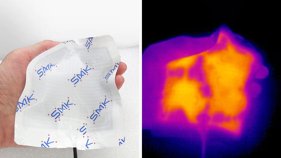 SMK's flexible film heater is a thin and flexible heating device made using stretchable, conductive ink on a special film substrate. As this heater can be bent and installed in thin spaces, it can add heating function to places that have curved surfaces or small thicknesses which were difficult to do so with past products.