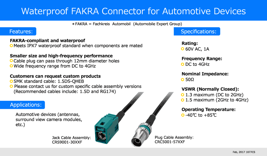 Waterproof FAKRA Connector for Automotive Devices SMK AmericaMarch 13, 2017 Facebook0 Twitter LinkedIn0 0 Likes