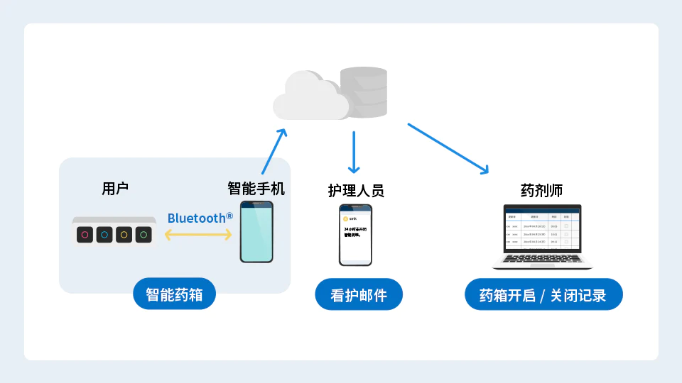 • 云端协作:通过传感器获取的数据会发送到云端,可以实时监控服药情况。